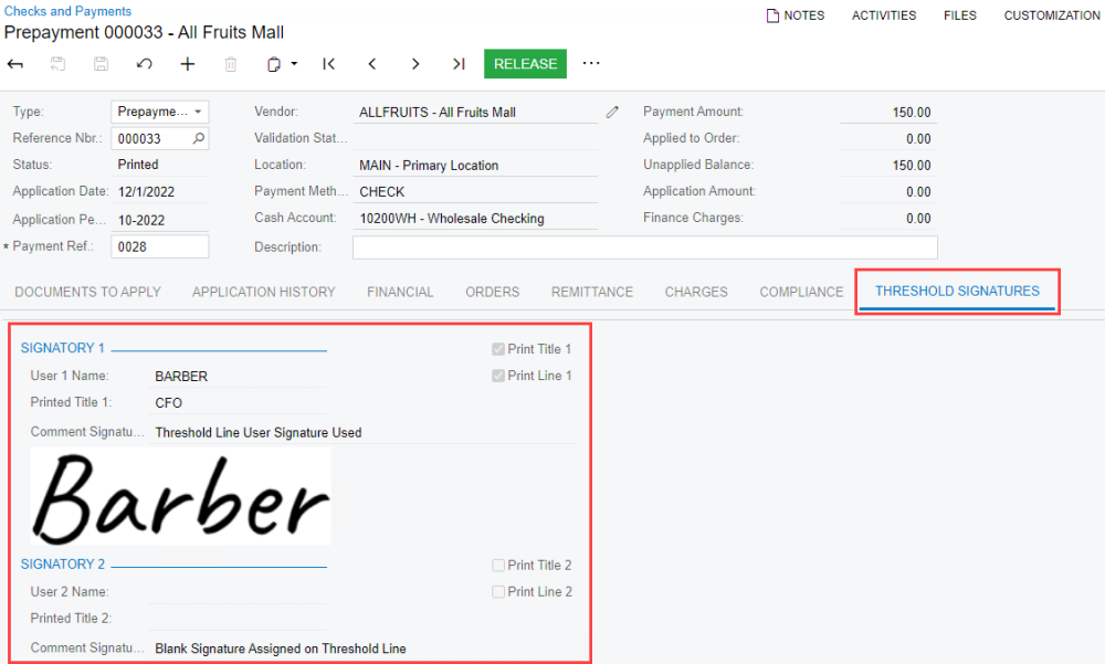 In some instances, you may want to review which signatures were used on specific payments. This can be helpful to maintain consistency and assist with any potential audits. Access a payment by navigating to Checks and Payments and selecting a payment. When the payment opens, navigate to the Threshold Signatures tab.