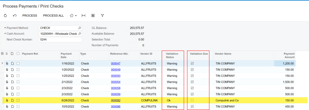 - Before payments are processed to vendors, the vendors that require a validation check will be validated. The figure below shows that when preparing to submit a payment, the system confirms that all but one vendor here are due for validation.