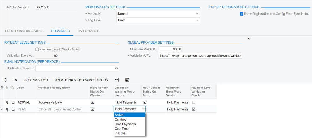 - To validate a vendor before a payment is released, ensure that Payment Level Checks Active is checked. Change how frequently this check is made by adjusting the number in the Validation Days Valid field. The Mekorma default is to run these checks every 90 days. Learn more about Payment Level Checks here.
