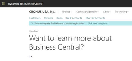 - To begin, click on the Click to Register hyperlink on the banner presented below the Business Central menu options.