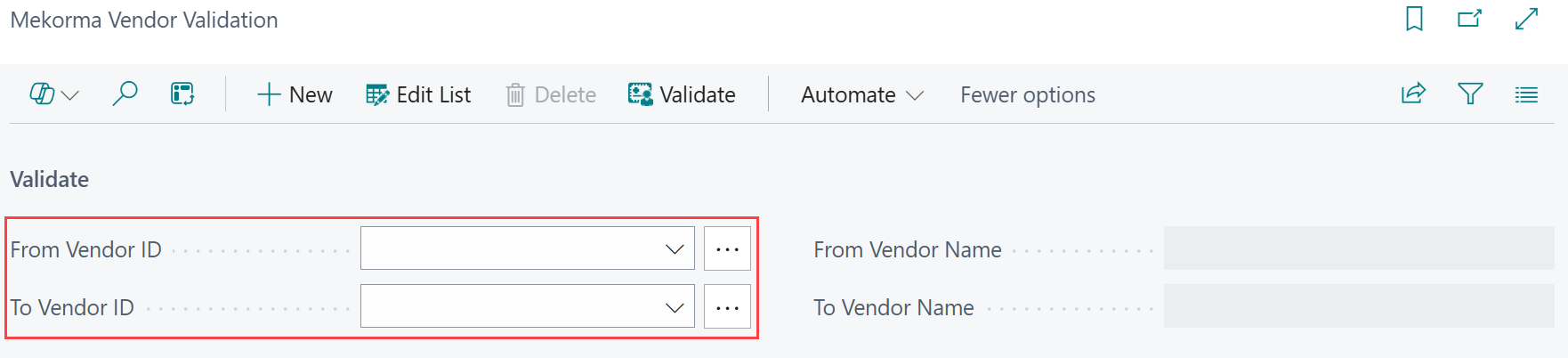 - Find vendors to validate by entering a range of Vendor IDs in the From Vendor ID and To Vendor ID fields. Enter the same vendor ID in both fields to validate just one vendor. To open the vendor card for a vendor listed in the From or To fields, click the ellipsis to the right of the selection.