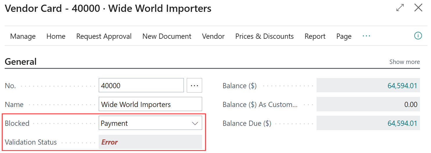 - If a vendor previously had payments blocked and obtains an OK validation status, you must manually update the Blocked field in the vendor card from Payments to blank to resume processing payments.