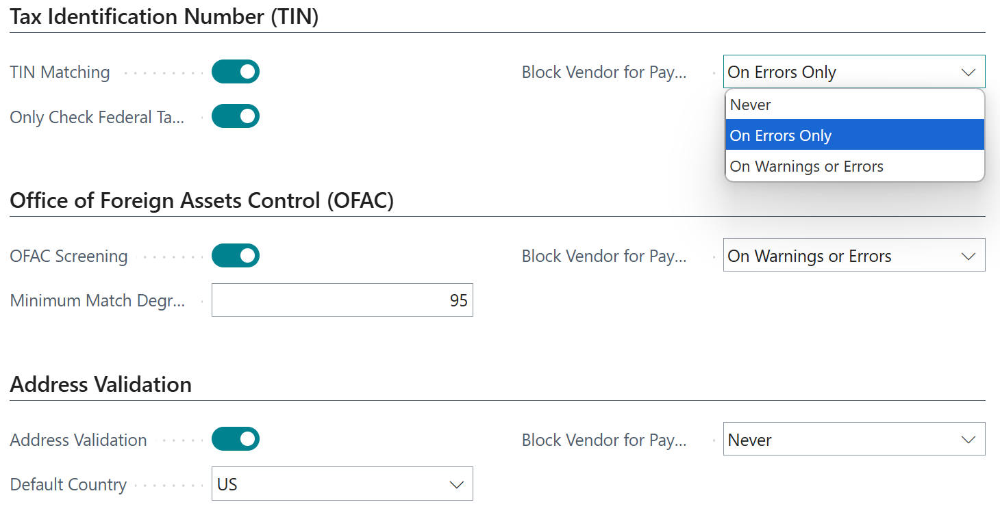 Block Vendor for Payment: Select when to block a vendor from payments. When the validation returns the status selected (i.e., it finds a warning or an error), the vendor is blocked, and payments will not be processed. If no warnings or errors are found, the vendor will not be blocked.