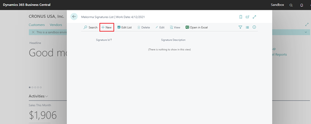 - In the Mekorma Signatures List page, click on the New button to set up a new signature.