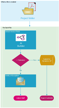 The AP Folder Monitoring workflow will monitor the project file folder for files saved by AP Mailbox Monitoring. This workflow leverages artificial intelligence to recognize the document fields and extract these, then submit and store them in a Microsoft Dynamics GP table, leveraging eConnect. A step within the workflow will notify AP clerks that they have invoices in Dynamics GP for review.