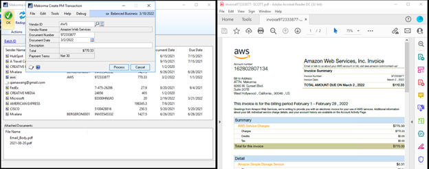 - Due Date: The AI will extract a Due date if present on the invoice and the system will use that Due date on the PM Transaction. However, if the vendor has default payment terms stored in the vendor master in Dynamics GP, those payment terms will over-write any Due Date from the invoice. In that case, the Due Date field will show but will be read-only. If you would like to use the Due Date from the invoice for a vendor with Payment Terms, you will need to override it in the PM Transaction Entry window.