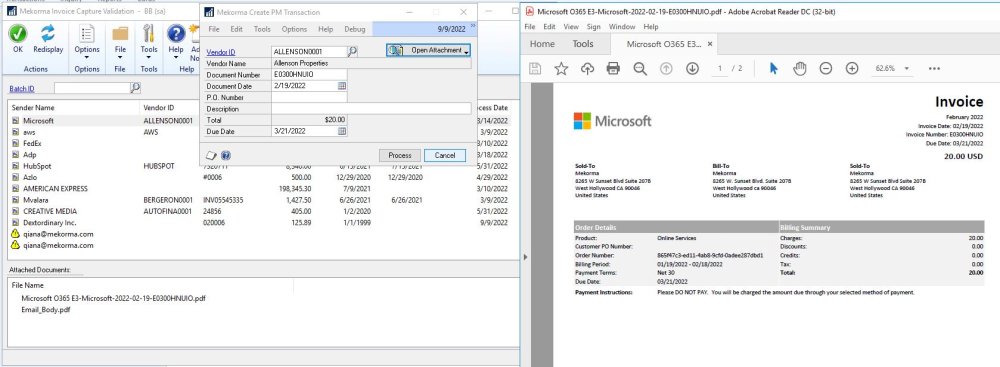 Double-click the Sender Name on an invoice line to open the Mekorma Create PM Transaction window.