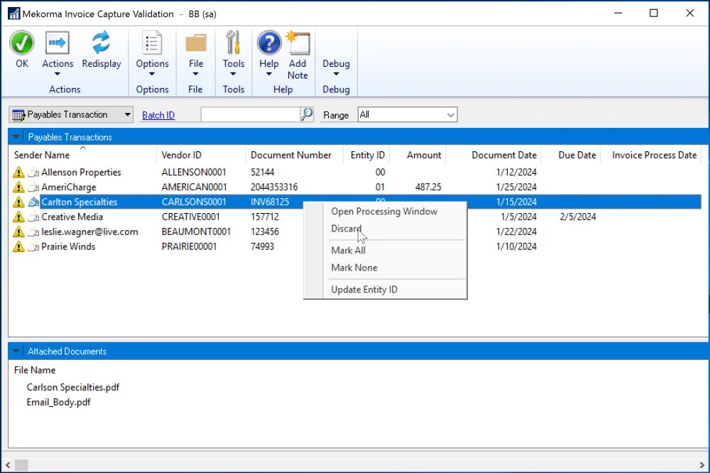 - Right click on Sender Name in the Mekorma Invoice Capture Validation window.
