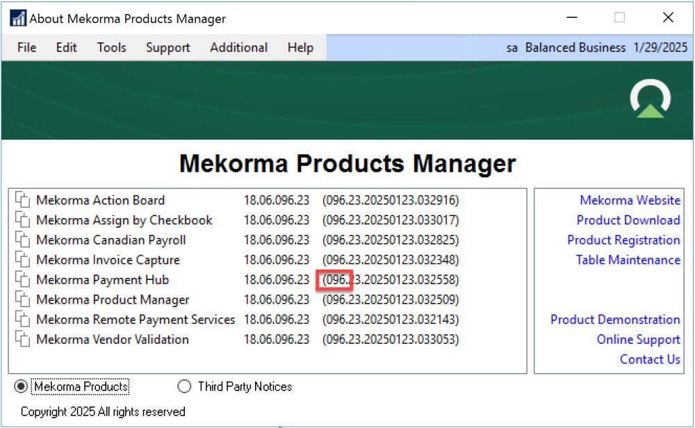 If you are unsure of which build of Mekorma Payment Hub you are using, use the About Mekorma Products Manager window to determine your build number.