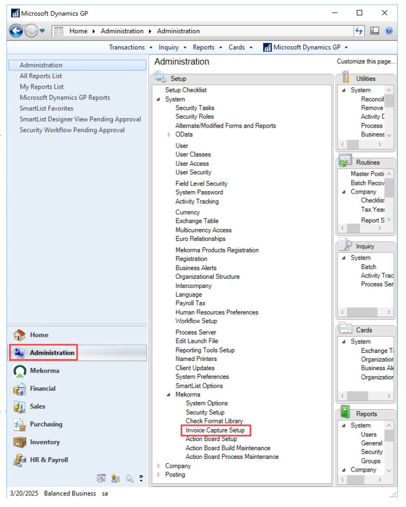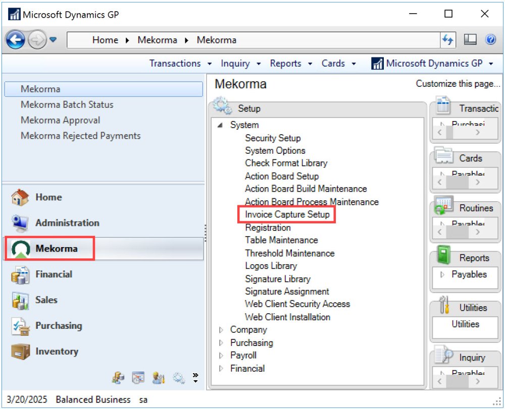 - Open the Invoice Capture Setup window from the Mekorma menu. (Mekorma > Setup > System > Invoice Capture Setup) or the Mekorma Area Page.