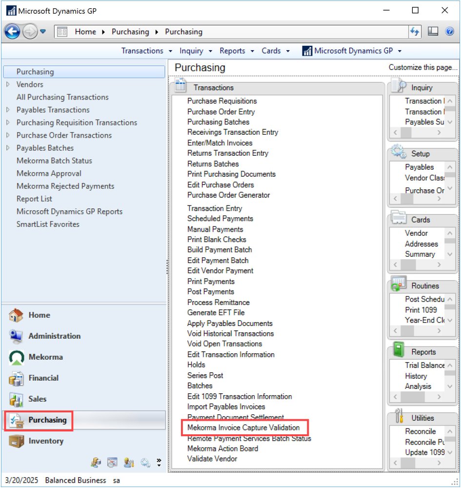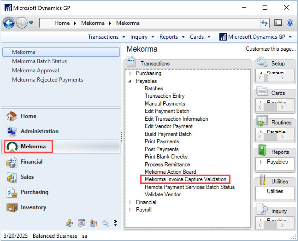 If you aren’t using Payment Hub, you can open the Invoice Capture Setup window from the Purchasing menu. (Purchasing > Transactions > Mekorma Invoice Capture Setup)