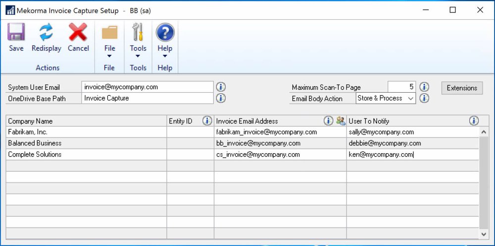 You may want to change who gets notified about new invoices captured in the system. You can make changes in the Mekorma Invoice Capture Setup window.