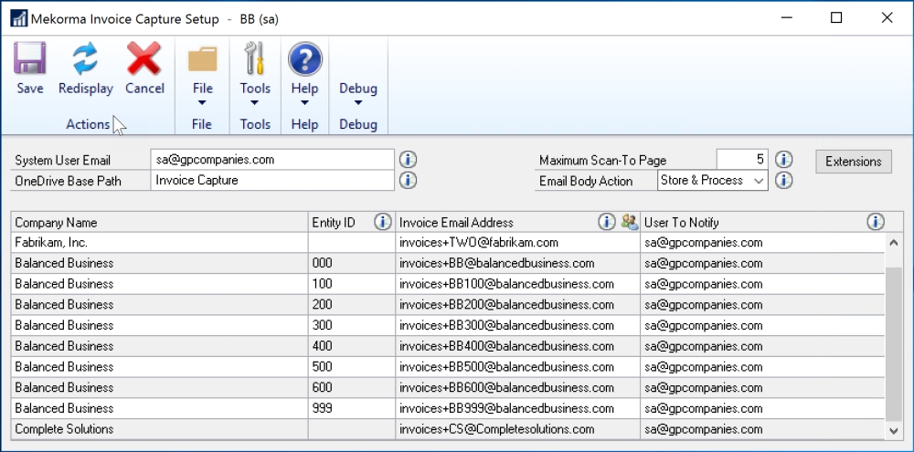 If you’re using MEM, there will be multiple entity lines for each GP company that uses MEM. You must enter a different invoice email per entity. When MEM is either not installed, or installed but disabled, the Entity ID column will be displayed, but the column will be empty. One row will be displayed for each GP company.