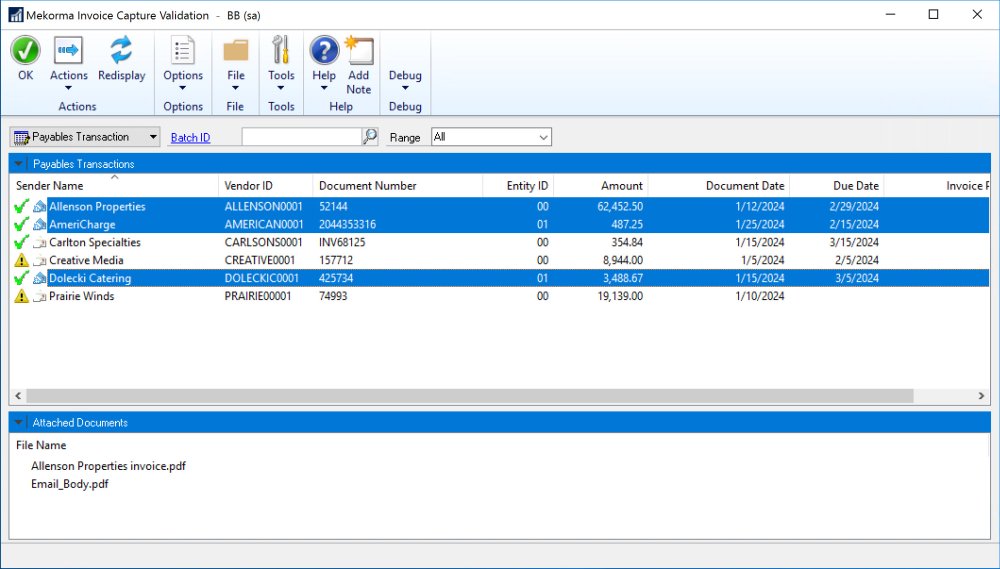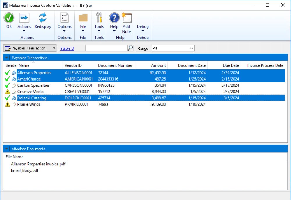 Mekorma Invoice Capture has the capability to process multiple payables invoices simultaneously. Purchasing invoices must be processed individually. To select the desired invoices, click to the left of the Sender Name field or hold down the Ctrl or Shift key while clicking the specific invoices. Right-click to open the context menu and perform the necessary action.