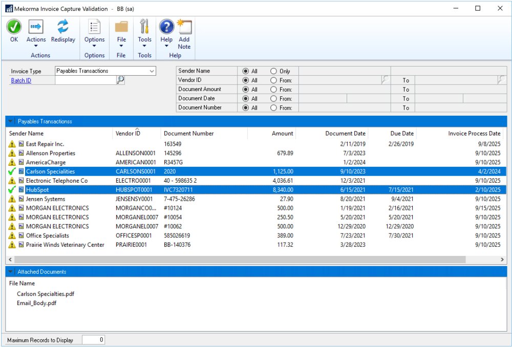 Mekorma Invoice Capture has the capability to process multiple payables invoices simultaneously. Purchasing invoices must be processed individually. To select the desired invoices, click to the left of the Sender Name field or hold down the Ctrl or Shift key while clicking the specific invoices. Right-click to open the context menu and perform the necessary action.