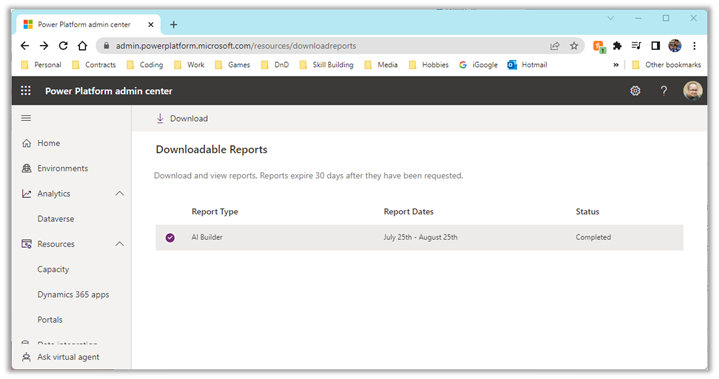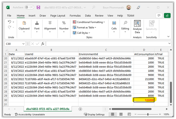 - Select the report and click Download to receive an Excel file. To view the credit used since the beginning of the payment period, add up the data in the AIConsumption column.
