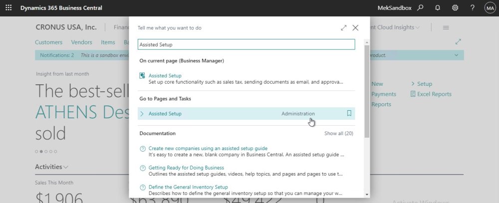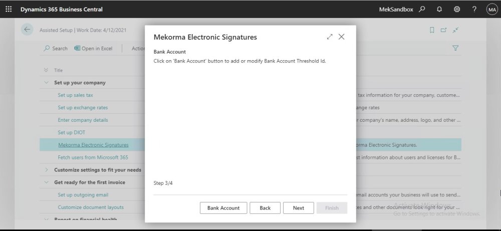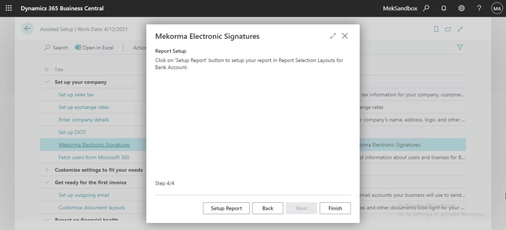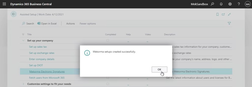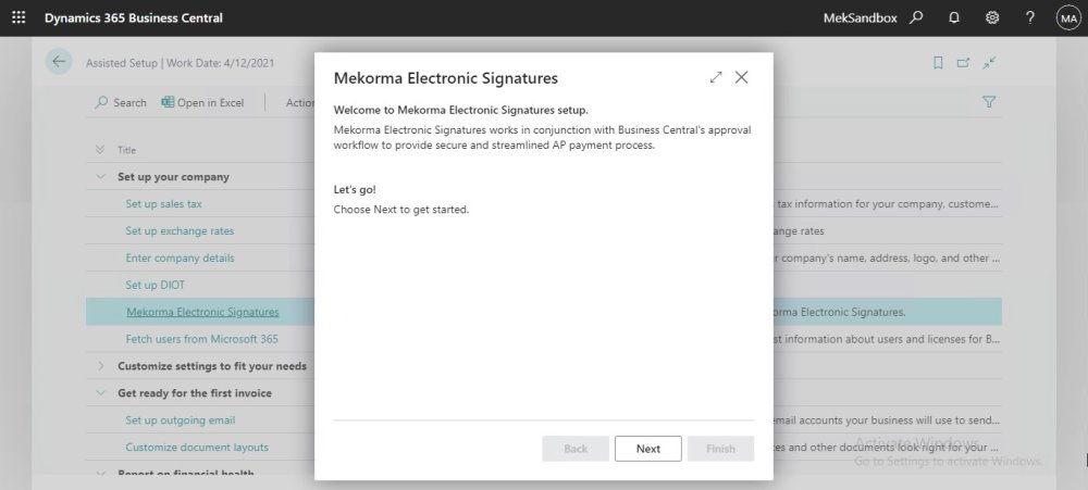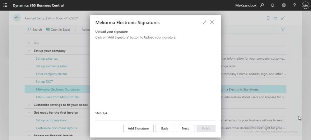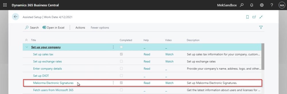 - In Assisted Setup page, we can find ‘Mekorma Electronic Signatures’ under the “Set up your company” category, select to start the setup.