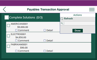 Mobile Workflows has a search function that allows you to search through all transaction/vendor headers, comments, and details. This is helpful if looking for something specific or you have many requests to review. To search, access the Actions menu in the upper right-hand corner of the screen by clicking the hamburger icon. This opens the Actions menu, where you can search your requests.