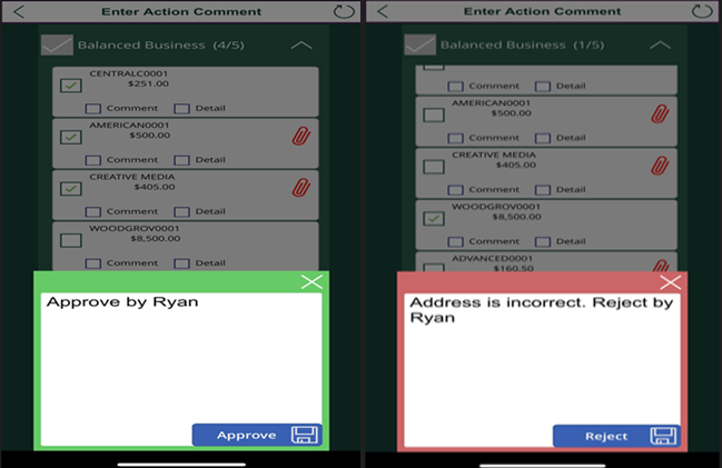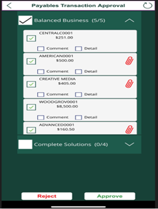 - Mobile Workflows allows you to batch multiple transactions at the same time for approval or rejection. To select all transactions for a specific business, use the checkbox next to the business name.