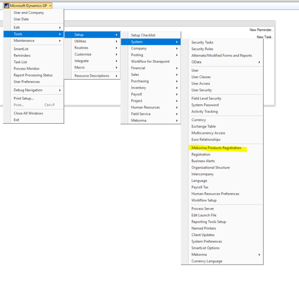 To view the product registration window, navigate to Microsoft Dynamics GP >> Tools >> Setup >> System >> Mekorma Products Registration. Here, you can either manually enter the provided product key or click Update Keys and the system will refresh and add Mekorma Mobile Workflows to your registered services (when you are connected to the internet).