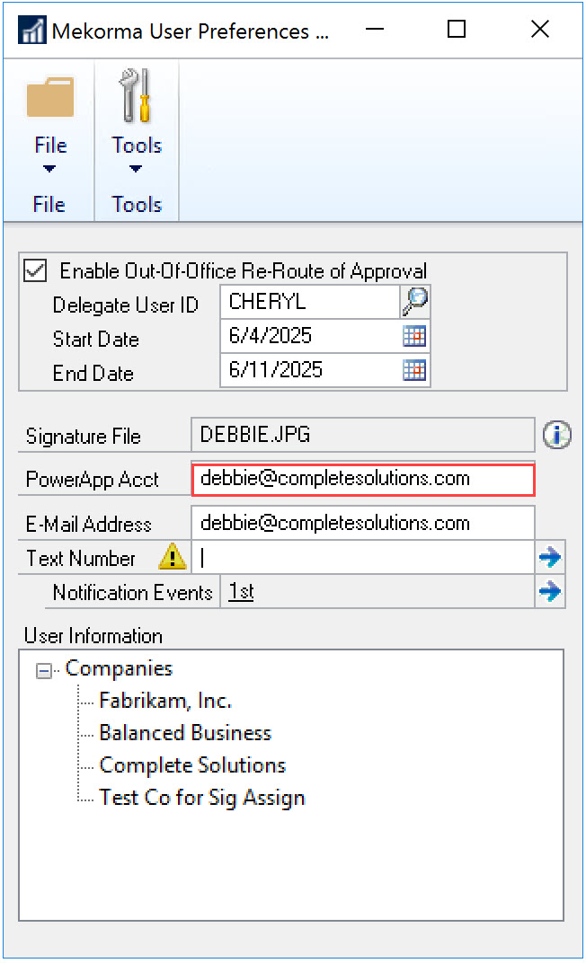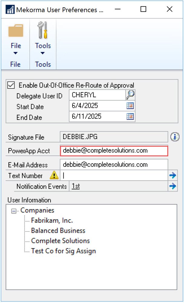 For users with Payment Hub installed, configuring Mobile Workflows in Dynamics GP allows you to map users through the Approval Email Setup window or through the Mekorma User Preferences window.
