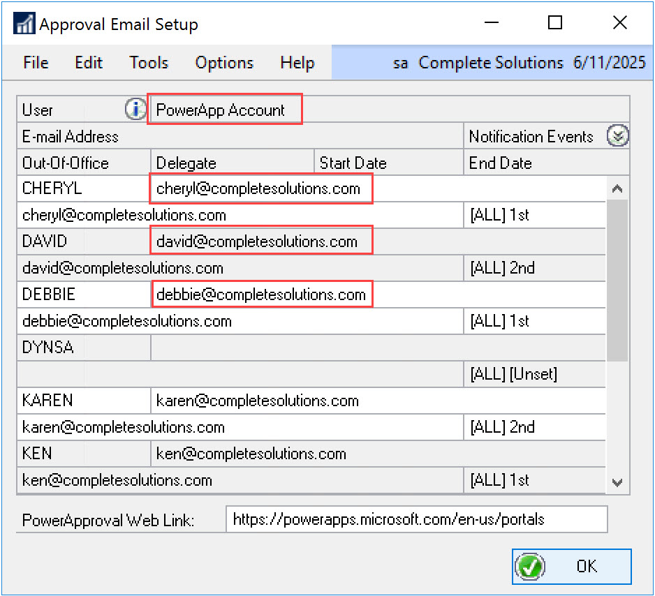 Using the Approval Email Setup window, an admin can grant access to multiple users at one time. To access this window: