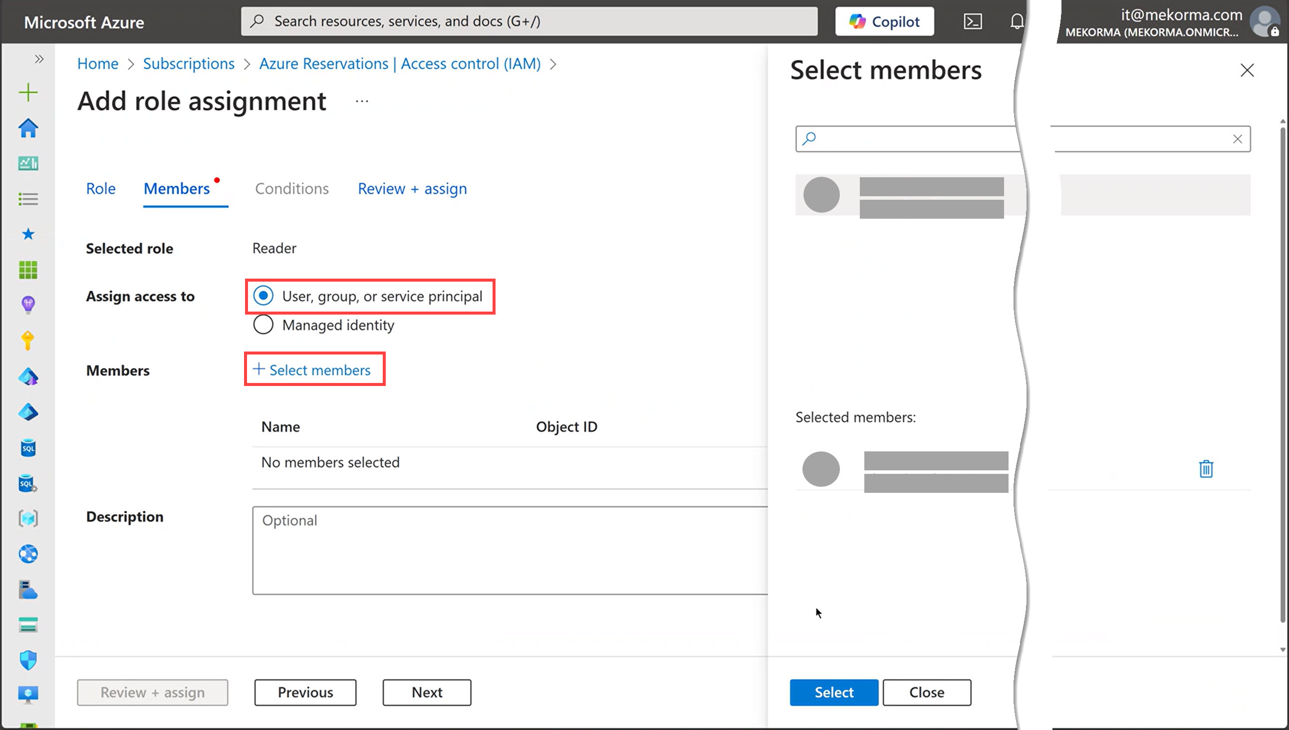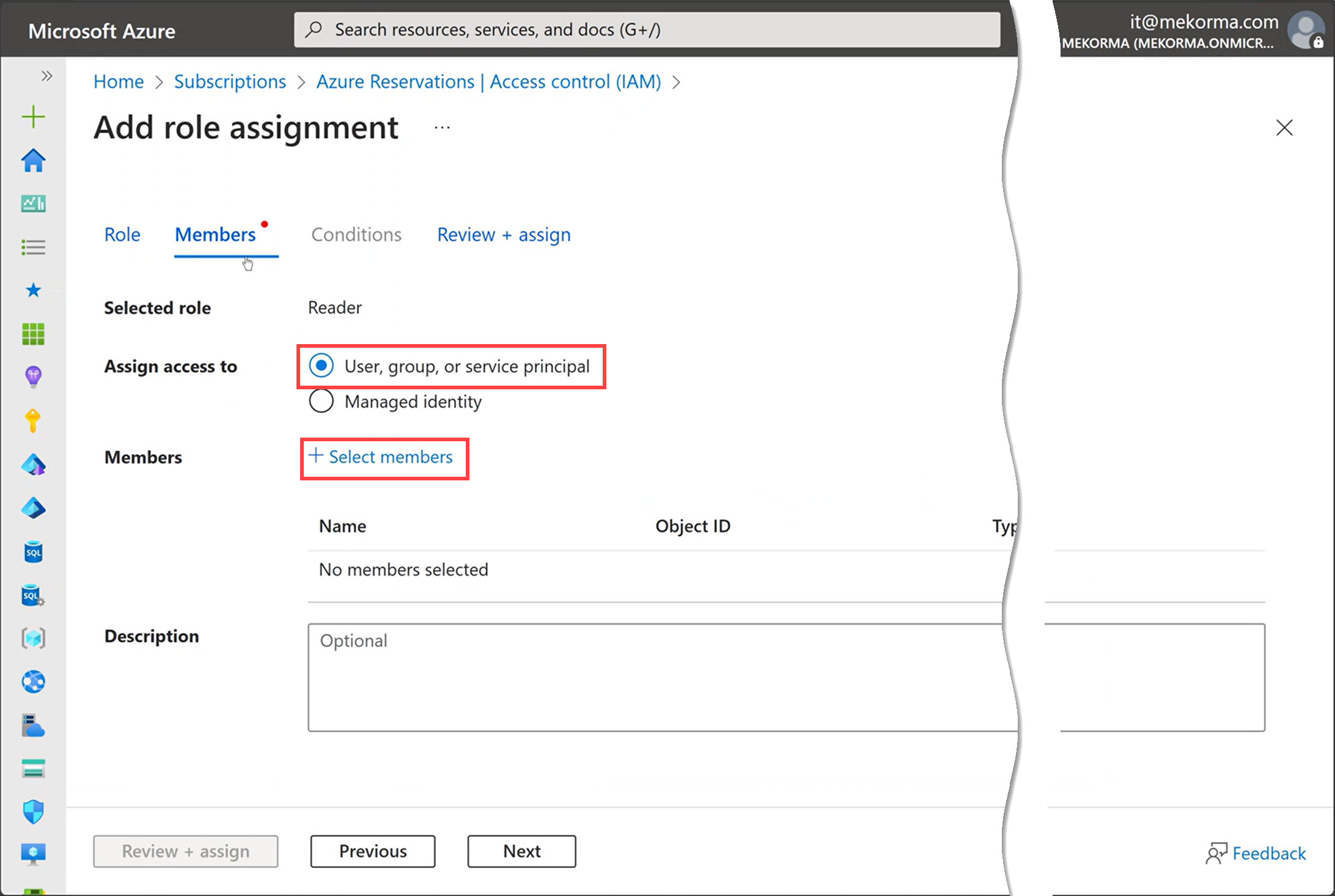 - Select to assign acces to User, group, or service principal and click + Select members.