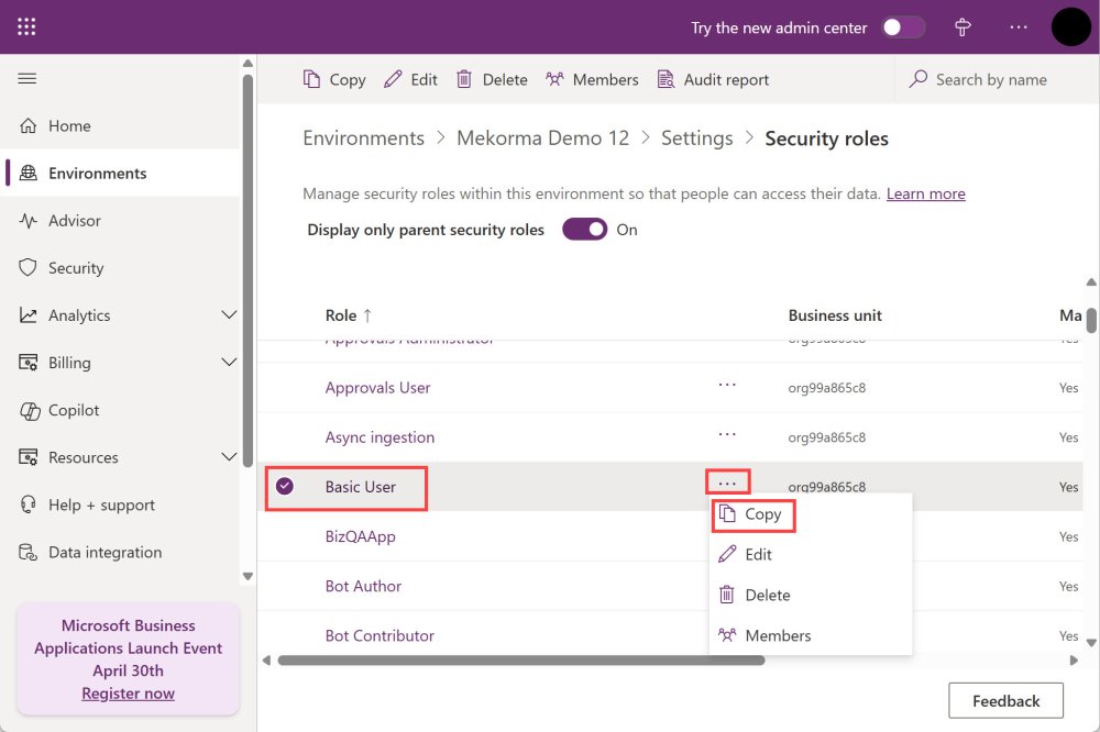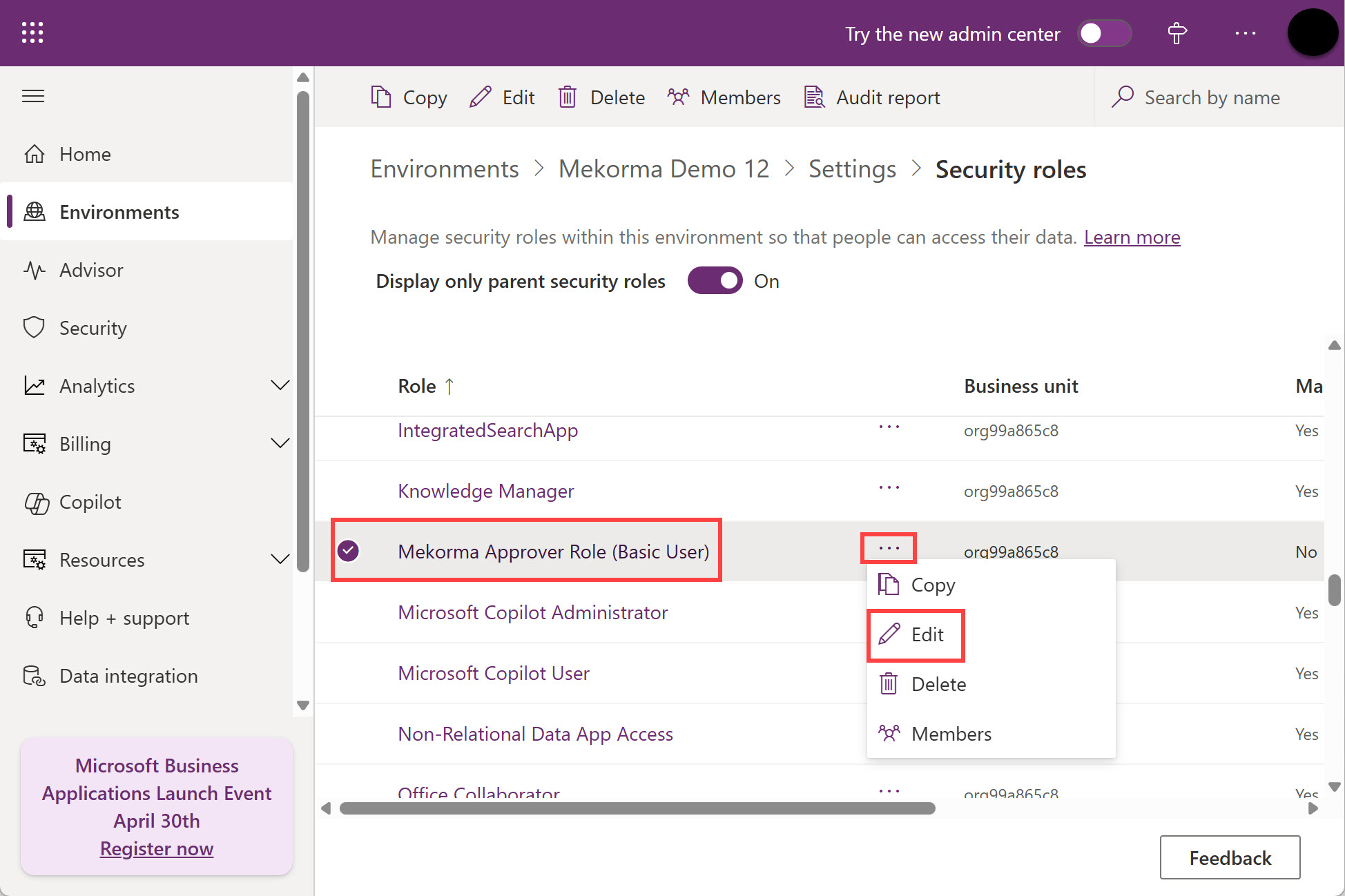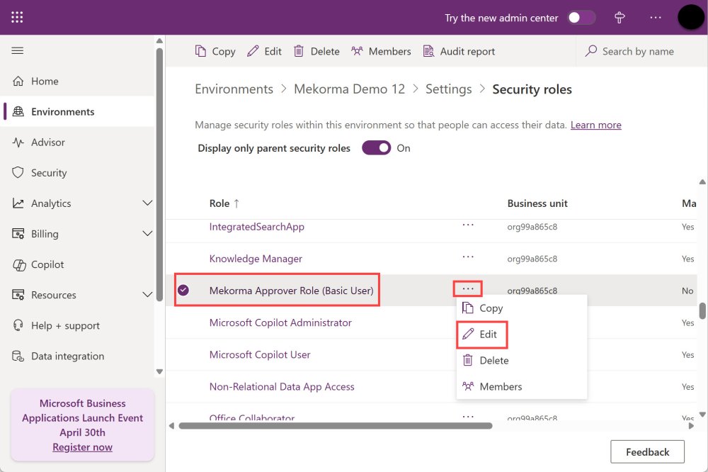 - Locate the Mekorma Approver Role (Basic User) role that you just created, click the ellipsis (…) next to it, and click Edit.