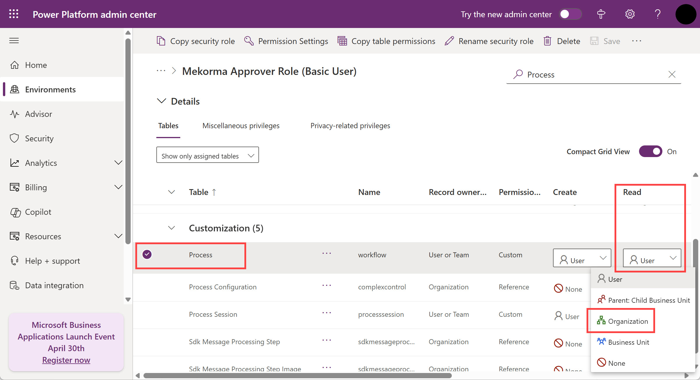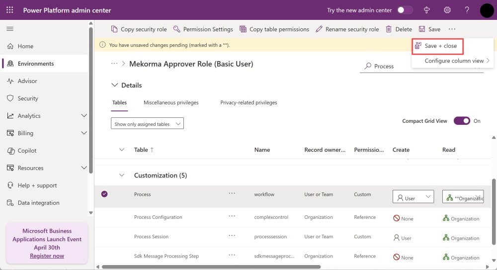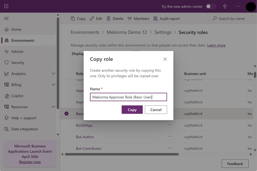 Duplicate the Basic User role to create a new role named Mekorma Approver Role (Basic User) and assign the Process Reader to the new role.