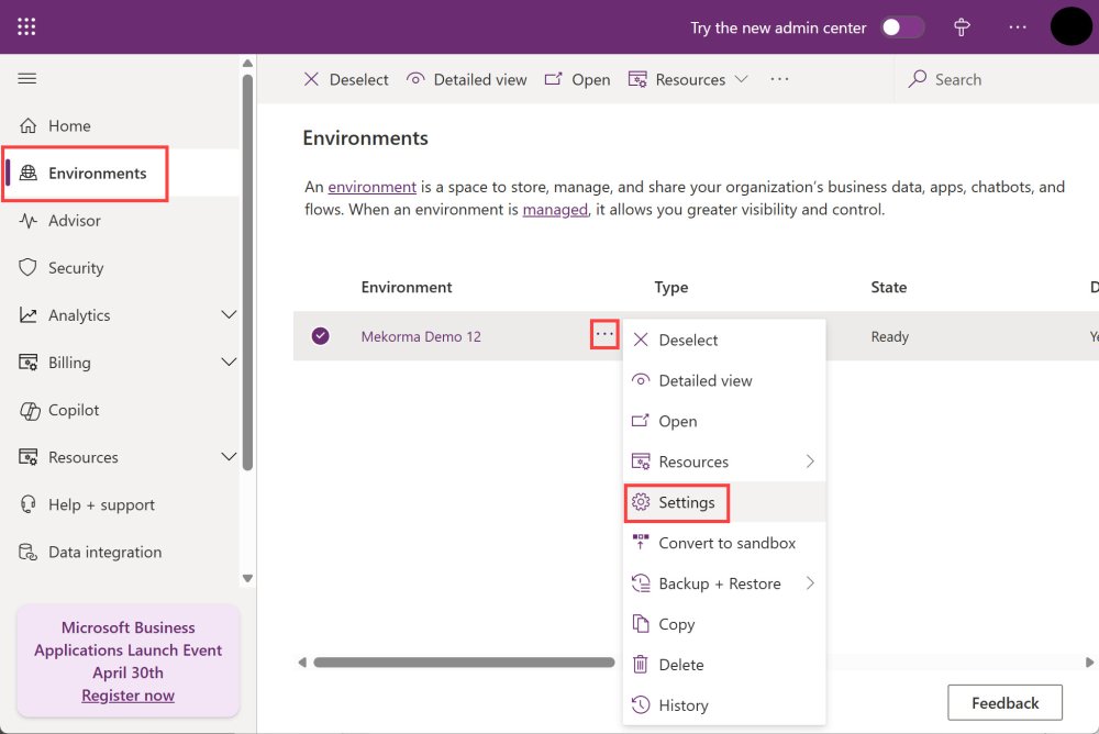 - Click Environments. Click the ellipsis (…) next to the environment which contains the Mobile Workflows solution and click Settings.