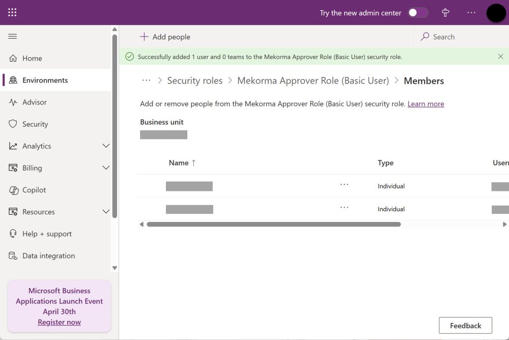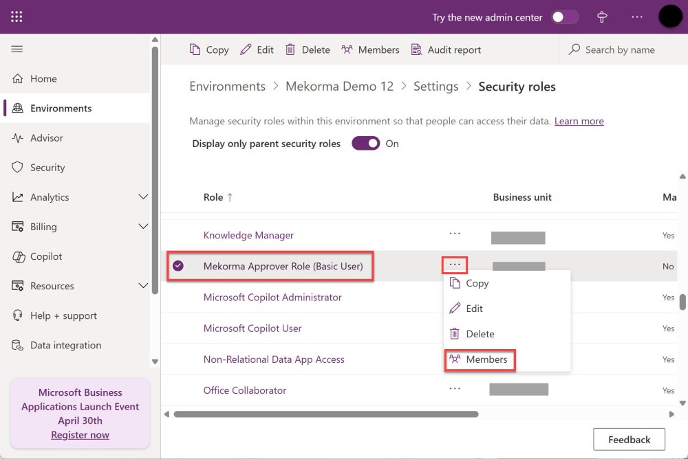 - Locate the Mekorma Approver Role (Basic User) role, click the ellipsis (…) next to it, and click Members.