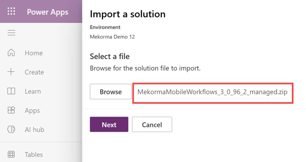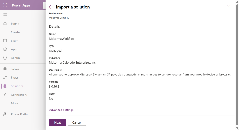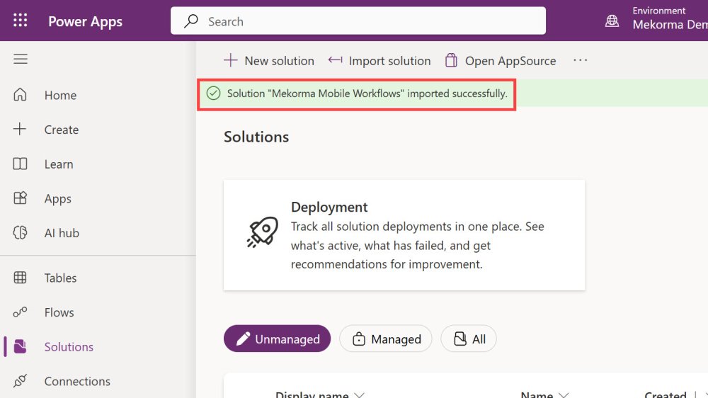 Use the following instructions to import the Mekorma Mobile Workflows solution.