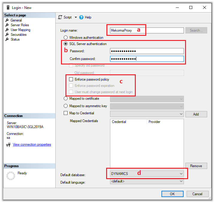 A SQL Server proxy login is a security principal, or entity that can be authenticated by Mekorma Mobile Workflows via the SQL Server cloud connector to access Dynamics GP databases and run Mobile Workflows server-side business logic. You can create a login based on a Windows principal (such as a domain user) or you can create a native SQL Server login.