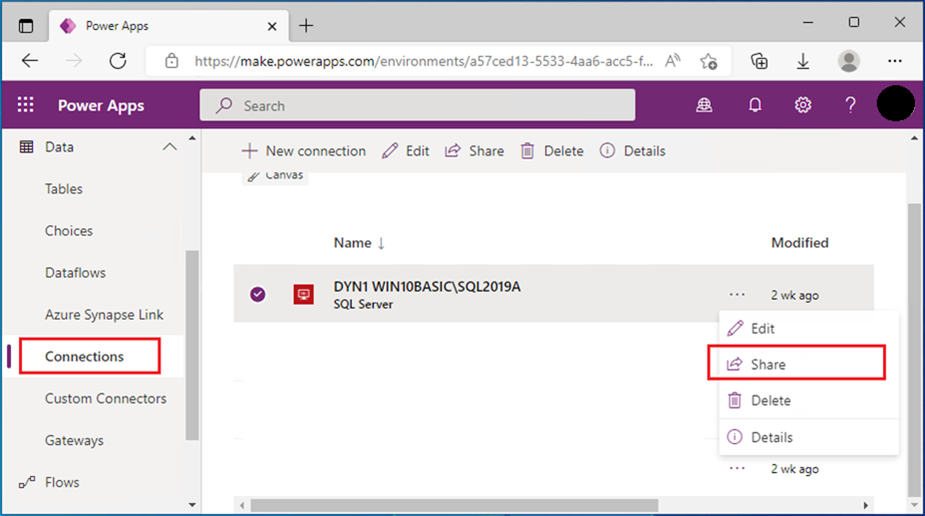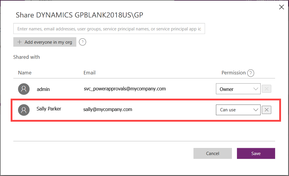 - Enter the email address of all people that will be approving via Mobile Workflows. In the screen shot below, we are sharing the SQL connection with Sally Parker.