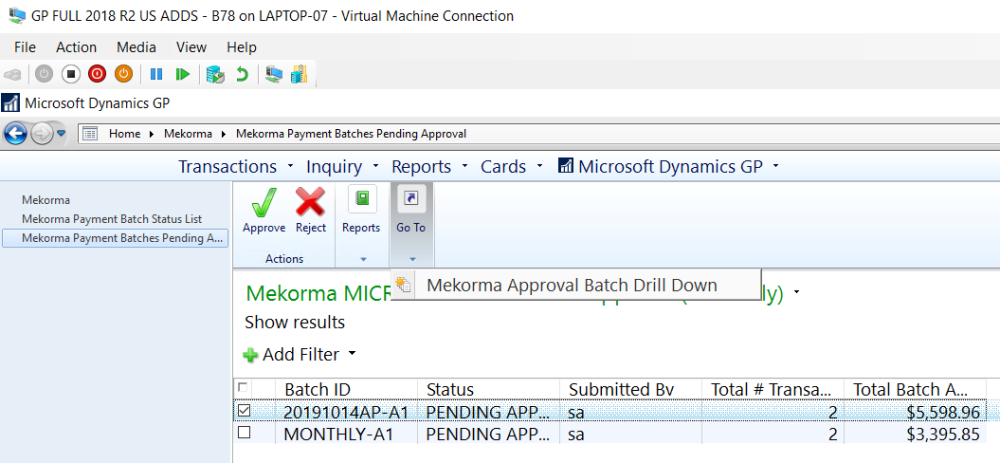 - To review the payments in a batch, select the batch and choose Go To > Mekorma Batch Drill-Down. You will be able to see all transactions in the batch. You cannot add or