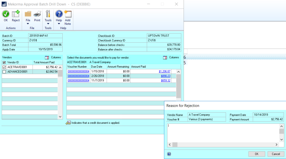 - If you want to reject a transaction that it is included within a particular vendor payment, you must reject the entire vendor payment. To do so, return to the Mekorma Approval Batch Drill-Down window and check the box next to that payment. Click Reject. You can type in a reason for rejecting if desired.