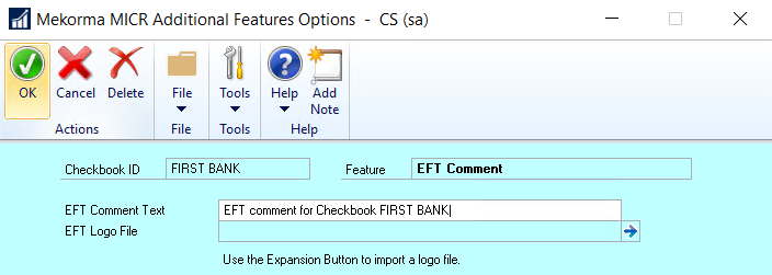 1. Type in content that you would like to populate the EFT comment fields for the checkbook that you’ve selected. When the EFT comment field is added to a layout in the Configurator, the information saved here will be used to populate that field upon printing.