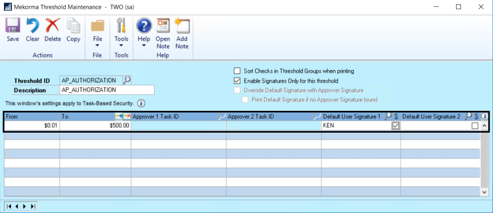 - When tabbing to the next line, the threshold will automatically readjust to the next possible monetary increment, so that there is never a dollar amount left out of your security configuration. In our example, for the second and final threshold, a different signature file will print on checks printed within this higher threshold range.