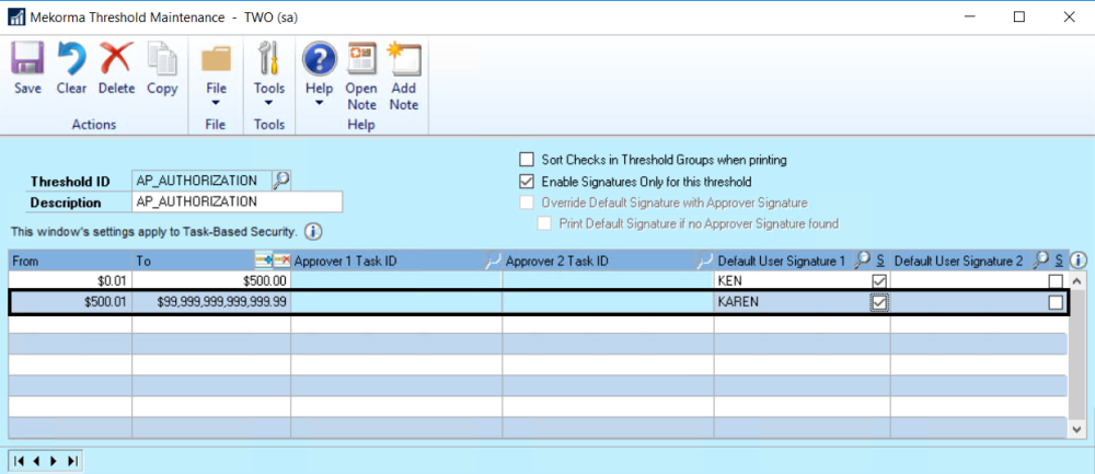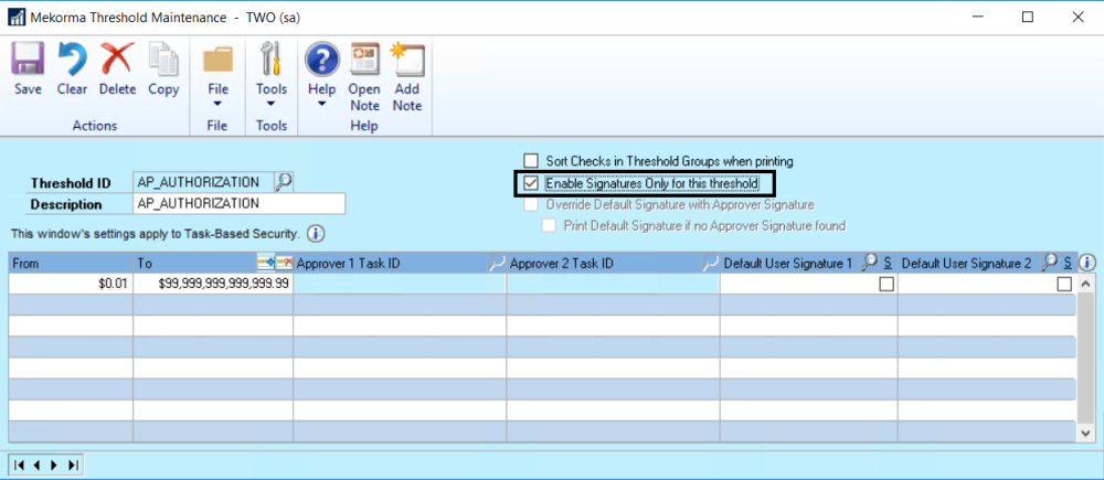 A Threshold ID allows you to save a series of threshold ranges, associated with default signatures, in the way that works best for your company. Threshold IDs are stored at the system-level, and can be assigned to checkbooks for cross-company use. Threshold IDs hold the logic that enables batch authorization to be applied to payment processes, and must be assigned to a checkbook in order to take effect.