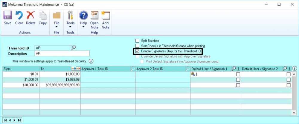 - Assign the Threshold ID to the checkbook to which you would like to apply these signatures.