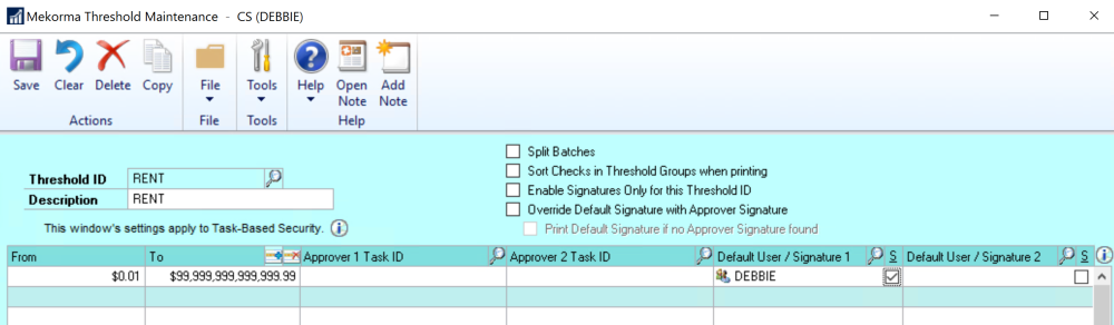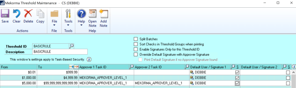 Advanced Approval Workflows use a combination of Checkbook Threshold ID and Vendor Class Security Threshold ID to designate powerful rule variations. In some cases, this will save work for the Approvers when certain payments can be automatically approved. In other cases, this can tighten controls when certain payments need extra levels of protection.