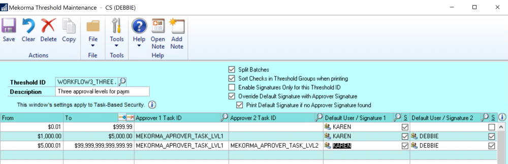 In this scenario payments under $1K can be processed without approval. Either KAREN and DEBBIE could approve payments in the $1K-$5K range by themselves. However, both of them need to approve payments over $5K.
