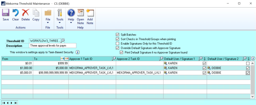 As you can see, there is a lot of flexibility in designating higher approval groups by using ranges and up-leveling the Mekorma Approver Role.