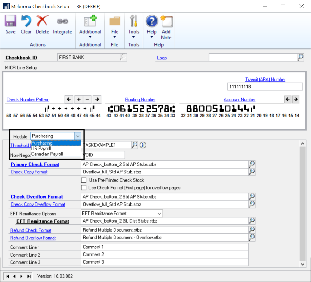 - Open the Mekorma Checkbook Setup window (Mekorma Area Page > Setup > Purchasing > Mekorma Checkbook Setup).