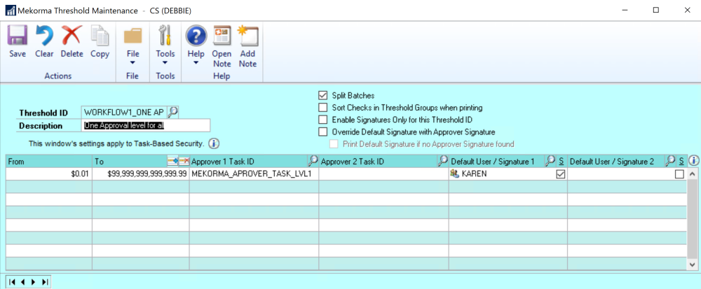 Important: now you need to go to Mekorma Checkbook Setup (Mekorma Area Page > Setup > Payables > Checkbook Setup) and make sure to assign that Threshold ID to the checkbook you want to use.