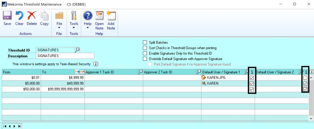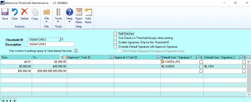 Configuring Threshold IDs for Signatures gives you the ability to automatically print signatures using dollar-value ranges and to print blank lines for handwritten signatures.