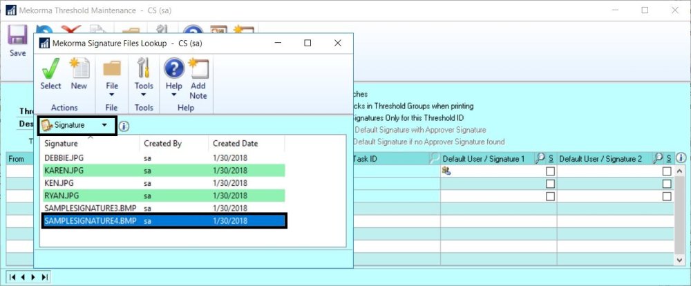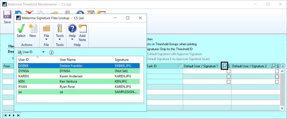 - Add a signature, using the look-up in the Default User/Signature 1 field. This opens the Mekorma Signatures Files Lookup window.