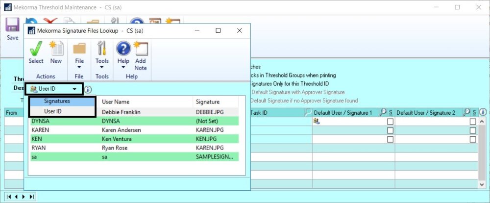 - If you want two signatures to print, perform the same action in the Default User/Signature 2 field. This will again open the Mekorma Signatures Files Lookup window.