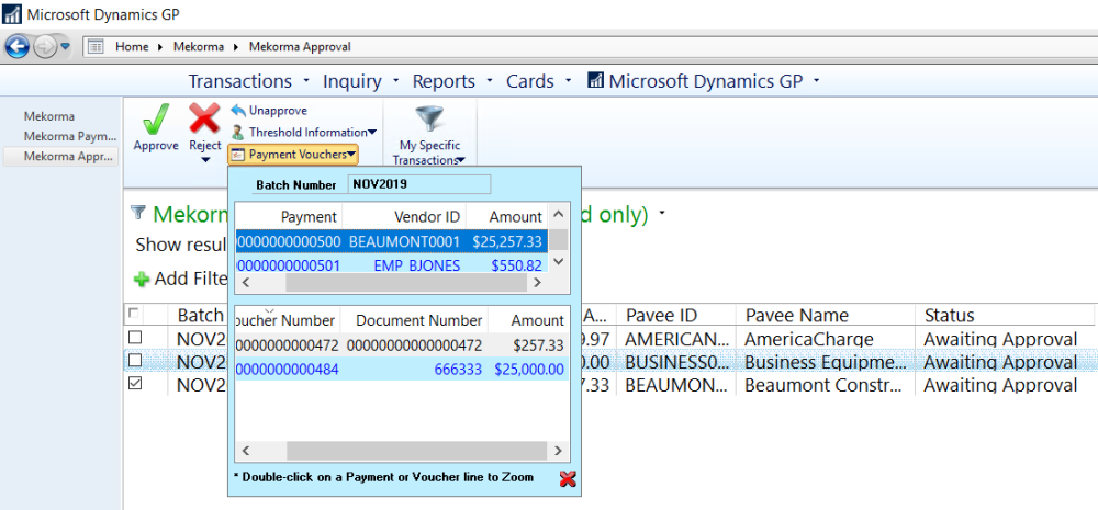 - Double-click on the desired payment in the upper section of the window. This will open the Mekorma Approval Batch Drill Down window.