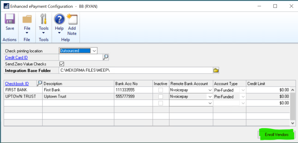 - Reopen the Enhanced ePayment Configuration window (Mekorma Area Page > Setup > Purchasing > Enhanced ePayment Configuration) and click the Enroll Vendors button.